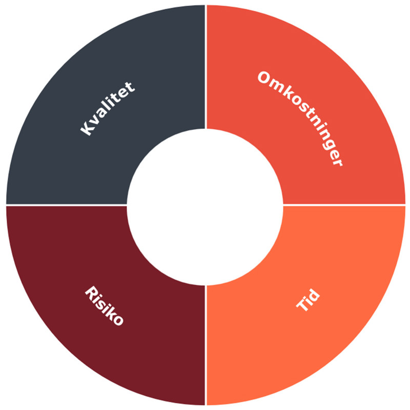 Prøv også at få balance i de forskellige prioriteter i en proces: omkostninger, tid, kvalitet og risiko, jf. figur 2.