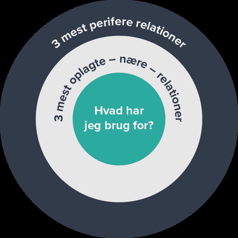 Inderste cirkel: Heri noterer du det, du har brug for. Det kunne være sparring på et emne, en kontakt eller viden om noget specifikt.